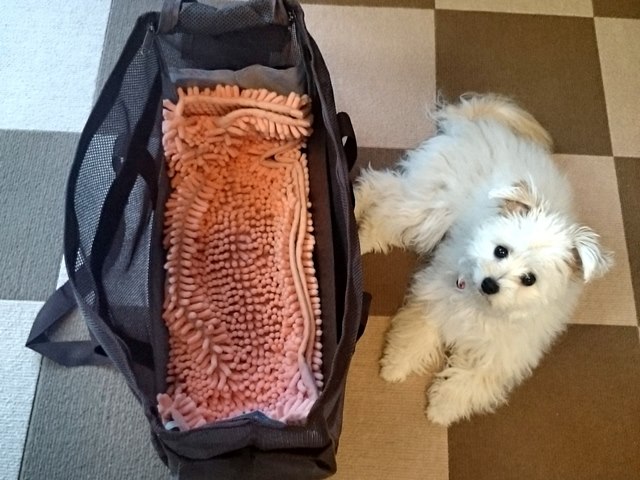 準備してたら、すぐ横でフセ。お出かけするのわかってるの?