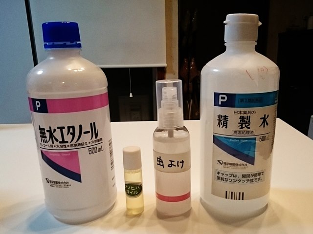 数滴のひば油を無水エタノールで溶かして、精製水で薄めると出来上がり!