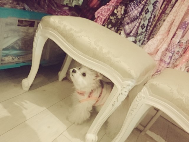 パフちゃんに好かれ過ぎてしまい、ビビッて椅子の下に逃げ込むくりん。